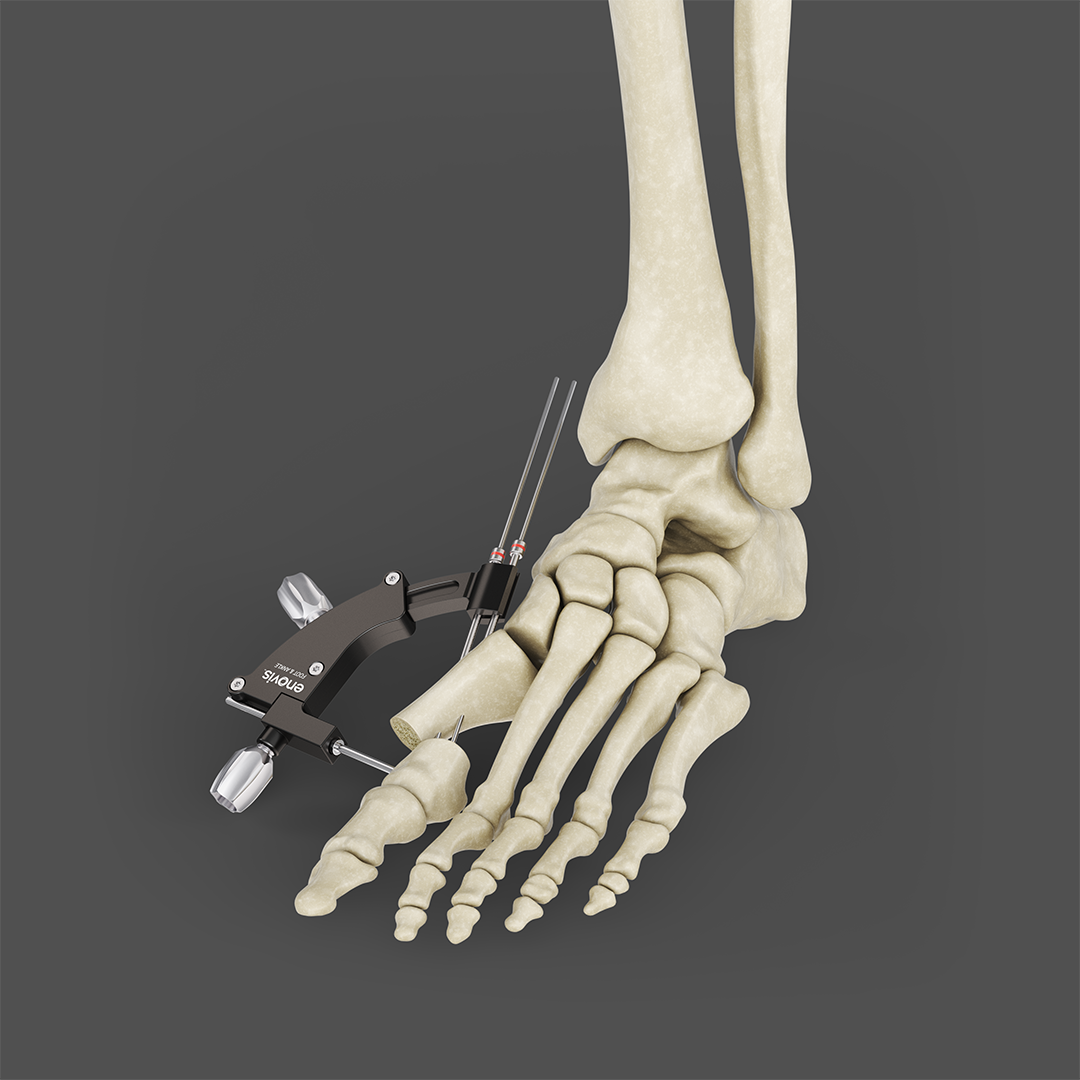 This project presents a surgical instrument for percutaneous forefoot correction through an isolated render and an anatomical context view. Metal surface treatment, combined with precise lighting and neutral backgrounds, enables a clear reading of geometry, machining, and tolerances.